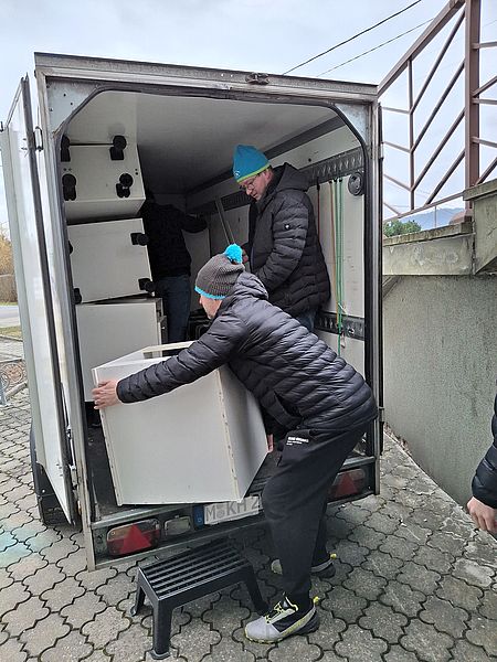 Dem Gemeindehaus fehlte eine vernünftige Küche. Die von uns gelieferte gut erhaltene Küche wurde an der hessischen Bergstraße demontiert. Die umfangreichen Küchenmöbel wurden sehr schnell ausgeladen, denn Pfarrer Marcin hatte genügend Helfer aus seiner Gemeinde zur Verfügung.